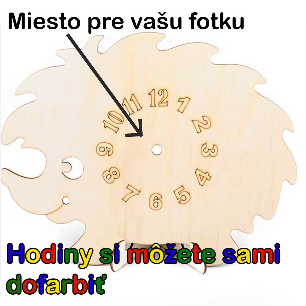 V cene sú vyfarbovacie hodiny ježko a úprava 1 fotky s krátkym textom v strede hodín.
