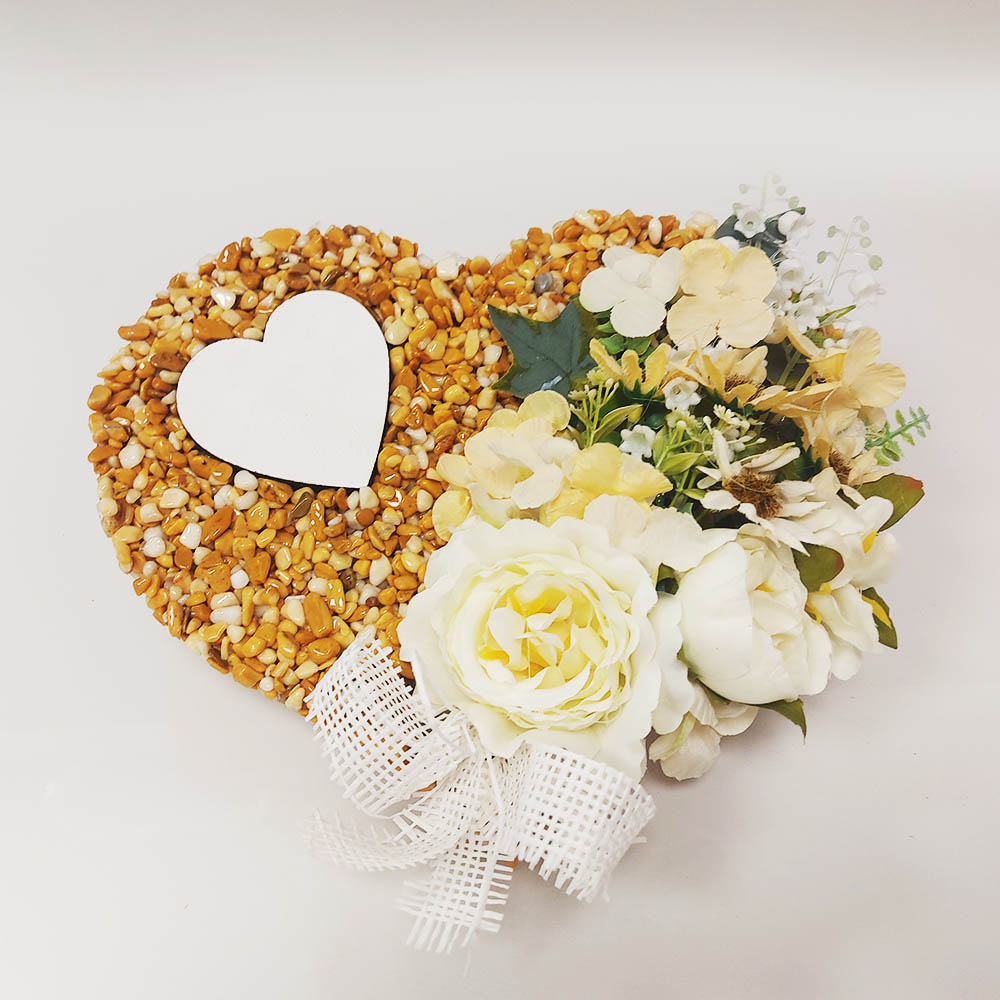Ak aj umelé kvety po čase stratia svoju krásu, kamienková základňa vám zostane. Stačí znova odekorovať a použiť. Túto dekoráciu tak môžete využívať aj dlhé roky. Podstavec pevne spojený so srdiečkom zaručí umelým kvetom dlhšiu životnosť aj v sychravom počasí.