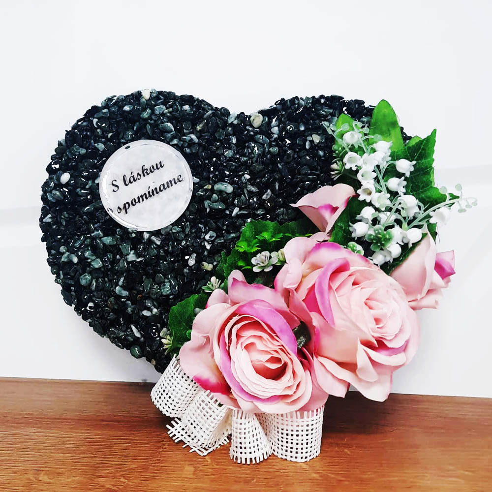 V cene je srdiečko z kamienkov zaliatych do živice, podstavec, okrasný prvok s textom „S láskou spomíname“ taktiež zaliaty do živice a ručné zdobenie kvetinovou výzdobou.