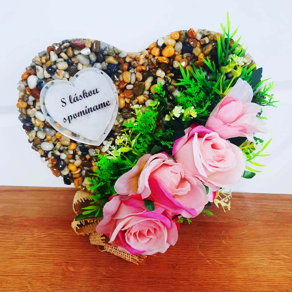 Ak aj umelé kvety po čase stratia svoju krásu, kamienková základňa vám zostane. Stačí znova odekorovať a použiť. Túto dekoráciu tak môžete využívať aj dlhé roky. Podstavec pevne spojený so srdiečkom zaručí umelým kvetom dlhšiu životnosť aj v sychravom počasí. Na objednávku vyhotovíme aj s vlastnou fotkou. Vďaka fotke minimalizujete možnosť krádeže. Veď, kto už by chcel dekoráciu s fotkou cudzieho človeka.