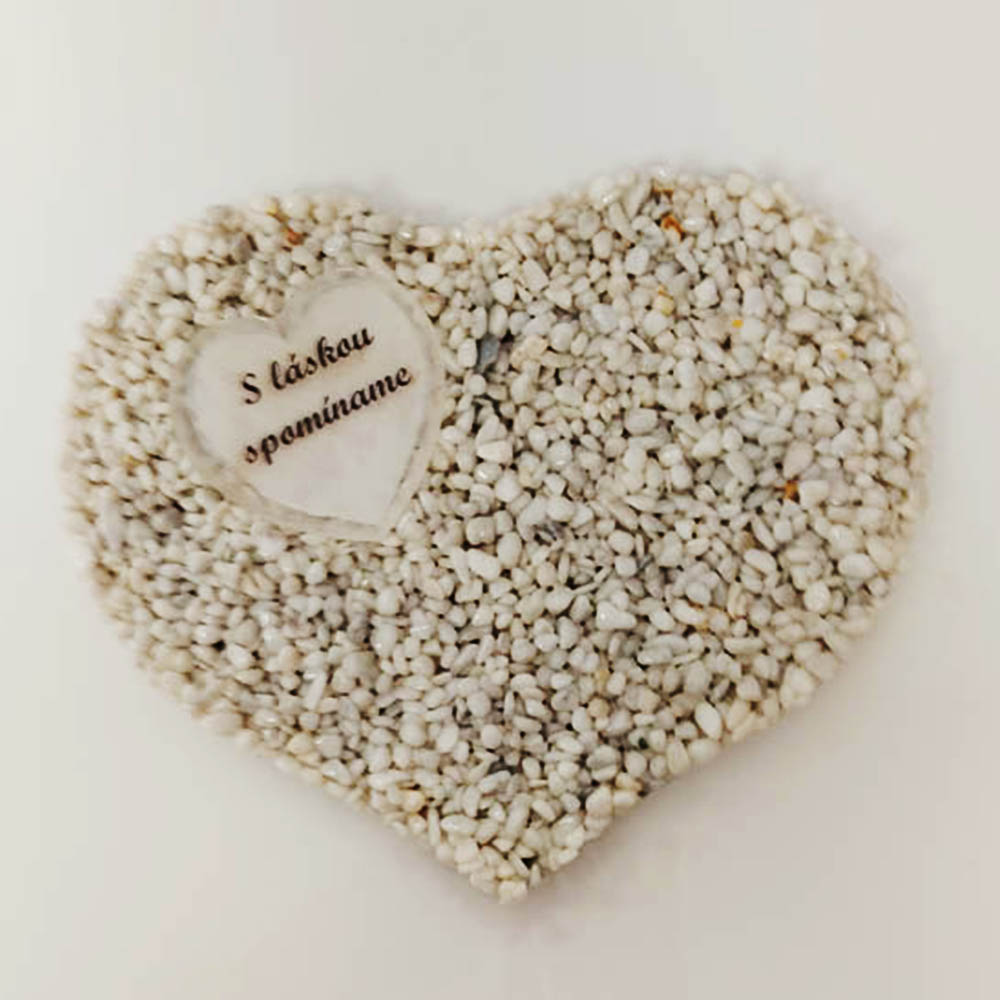V cene je srdiečko z kamienkov zaliatych do živice, podstavec a okrasný prvok s textom „S láskou spomíname“ taktiež zaliaty do živice.